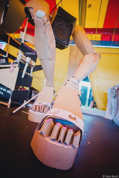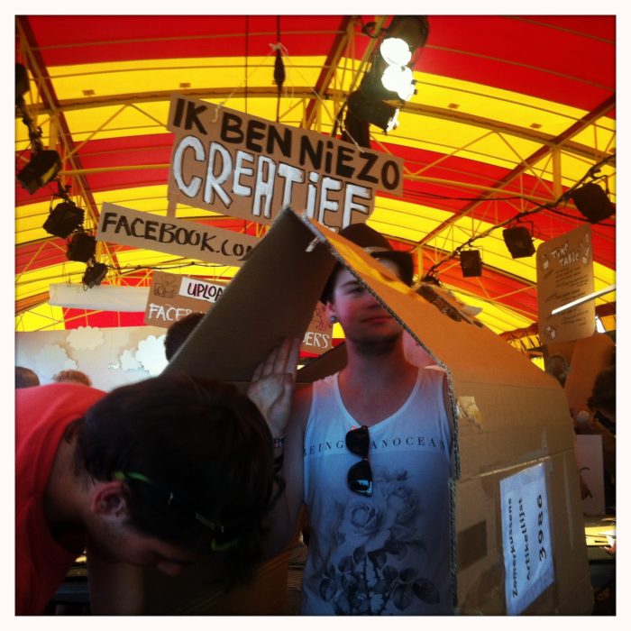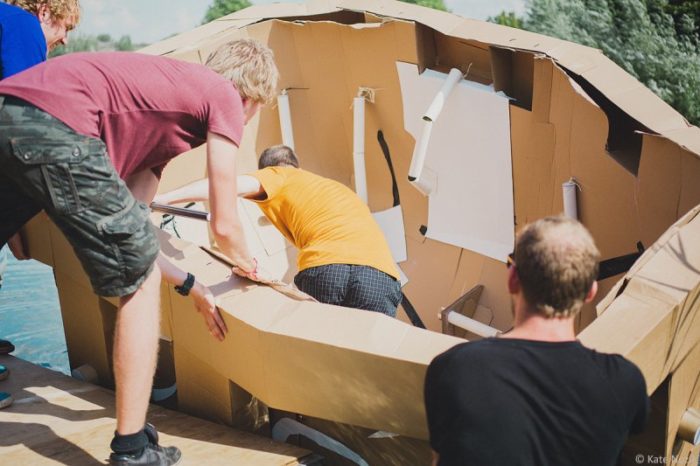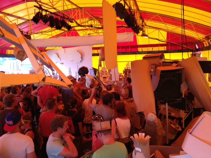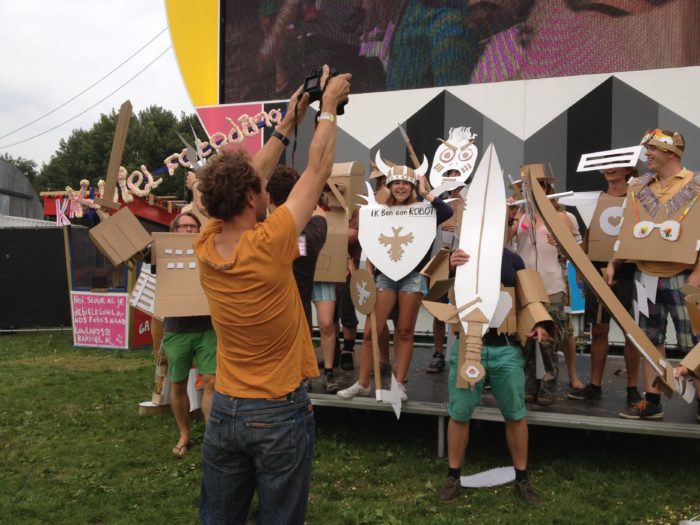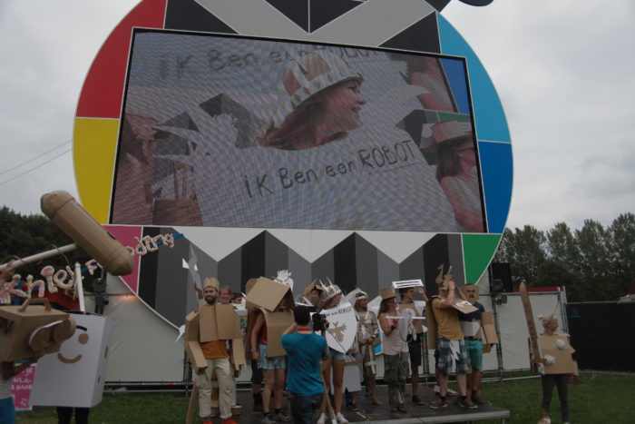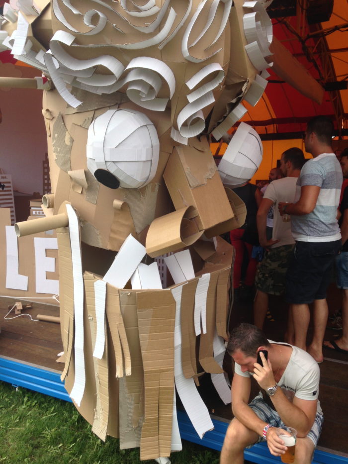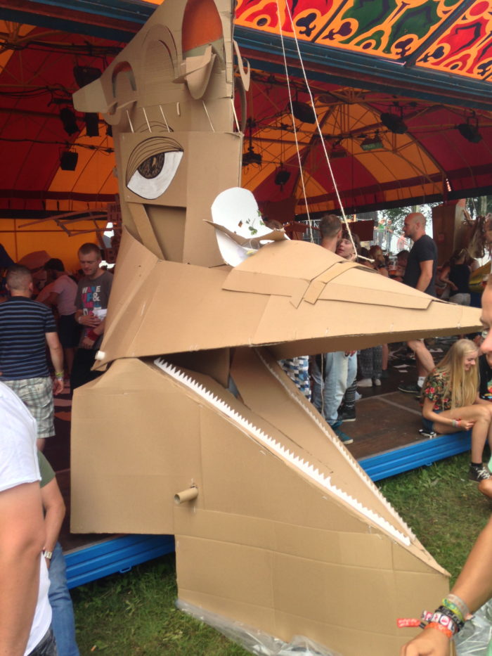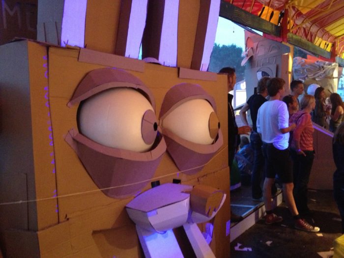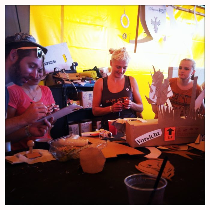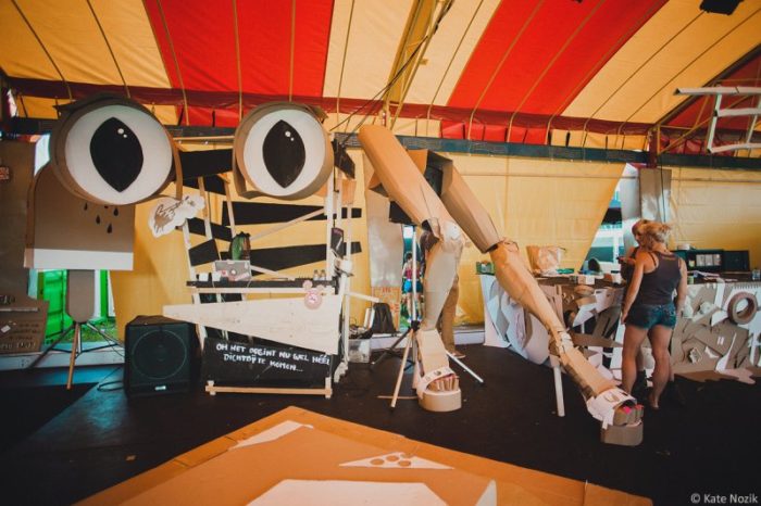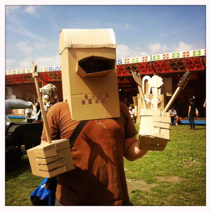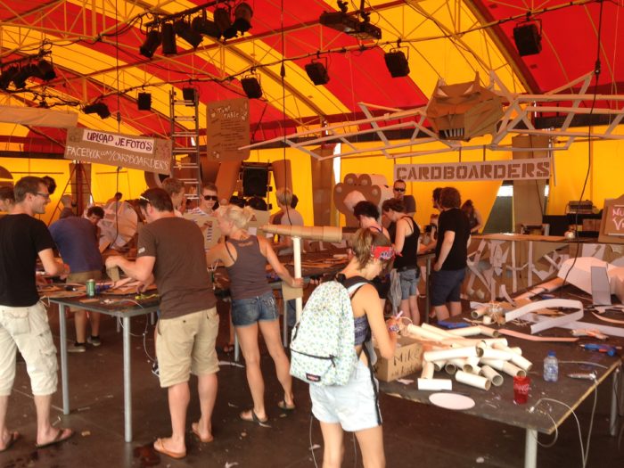 We came to the Lowlands festival with 22 hyped out Cardboarders from the Netherlands and Russia! Four days later 60.000 Lowlanders poured in to the terrain and just took over our venue (an old bumperstage). Crafting and tinkering people were everywhere! If you like to read something about the ambience: a great piece of (dutch) writing on 3voor12. Saturday was Cardboard Robotbuilding Day! LTV (captain video) made us a video of the Robot Run. On sunday we made some cardboard boats and tried the out: live on national radio! And then there was the parties at night, screening the weirdest animations from the KLIK! animation Festival!