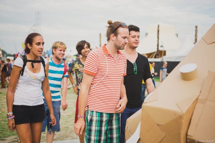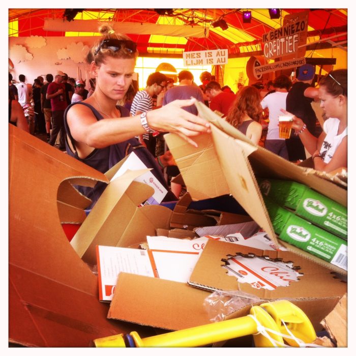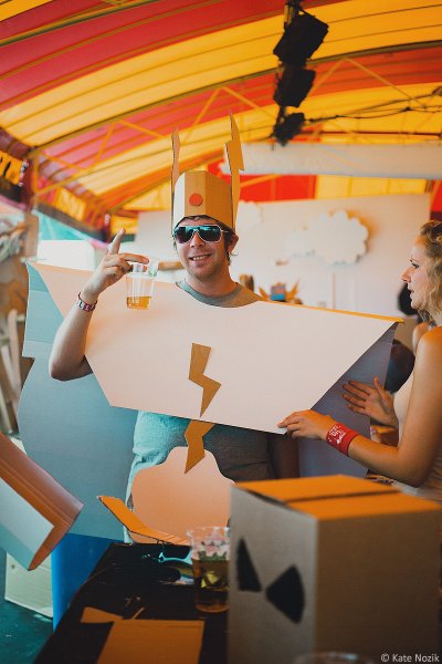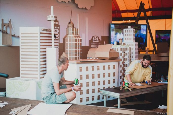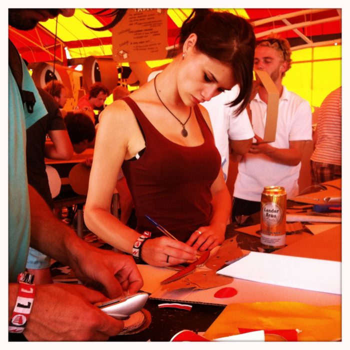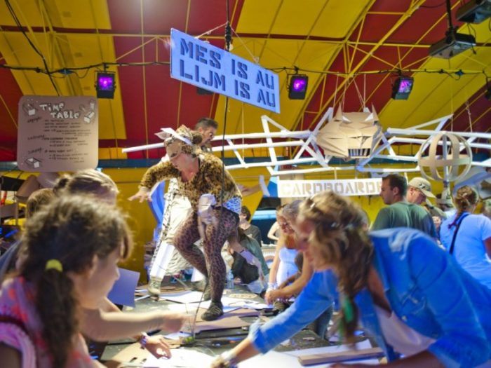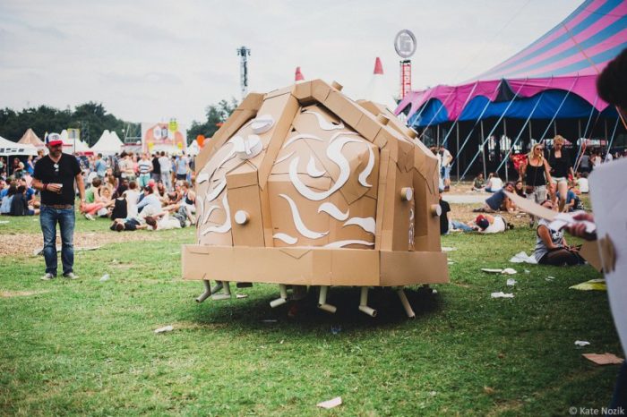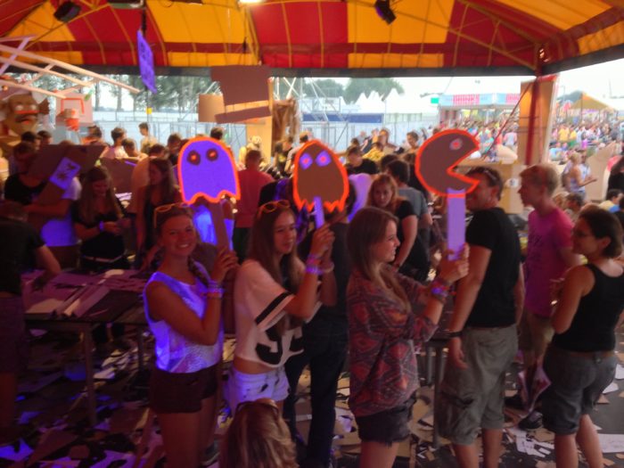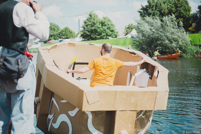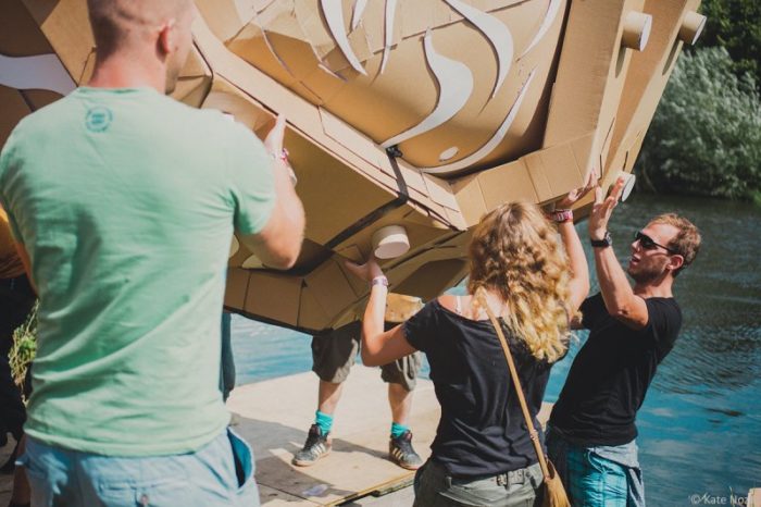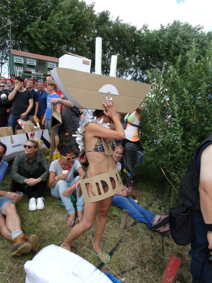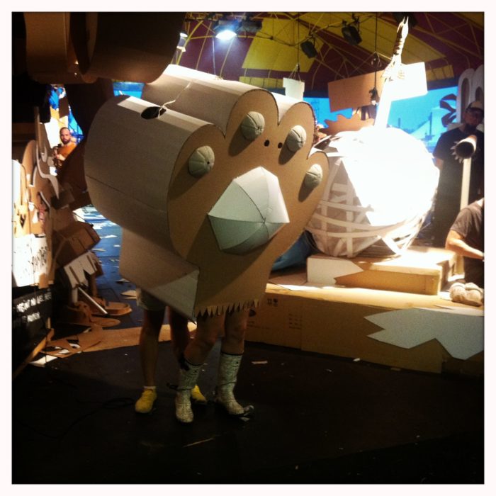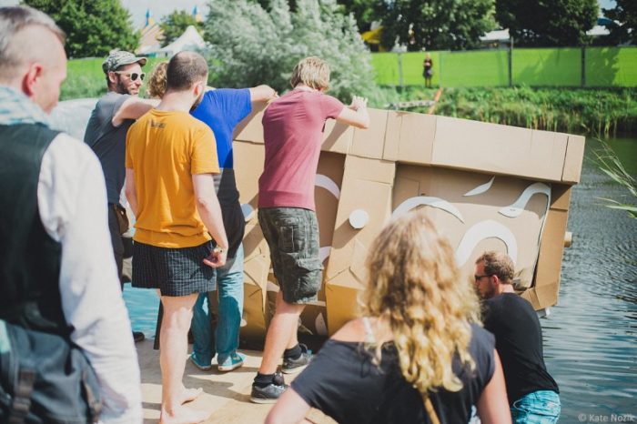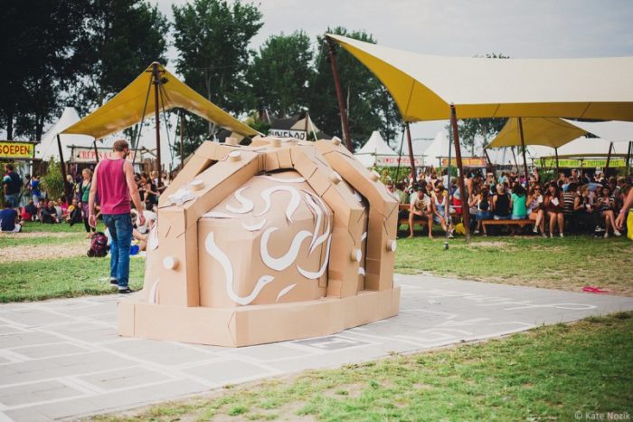 We came to the Lowlands festival with 22 hyped out Cardboarders from the Netherlands and Russia! Four days later 60.000 Lowlanders poured in to the terrain and just took over our venue (an old bumperstage). Crafting and tinkering people were everywhere! If you like to read something about the ambience: a great piece of (dutch) writing on 3voor12. Saturday was Cardboard Robotbuilding Day! LTV (captain video) made us a video of the Robot Run. On sunday we made some cardboard boats and tried the out: live on national radio! And then there was the parties at night, screening the weirdest animations from the KLIK! animation Festival!