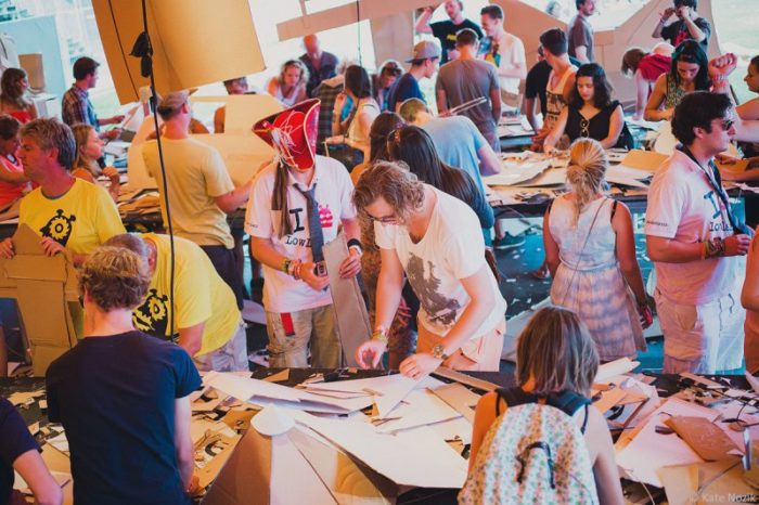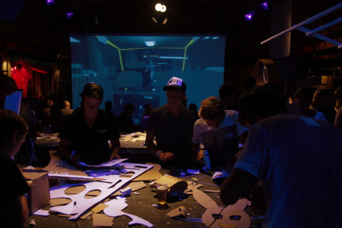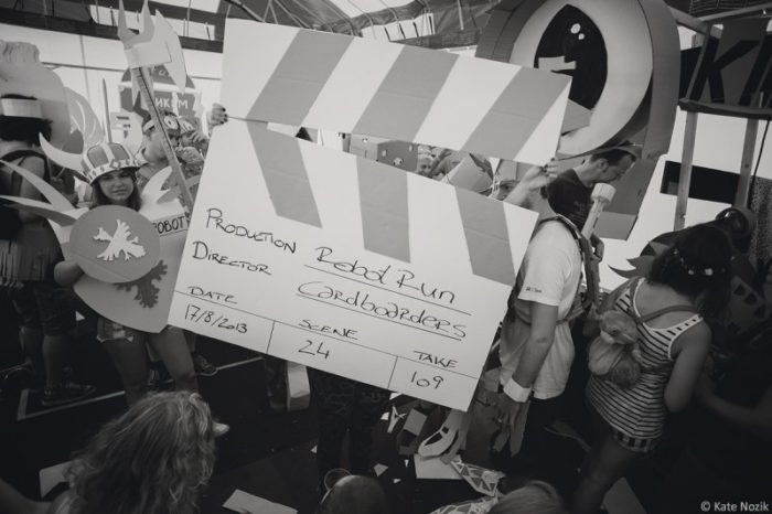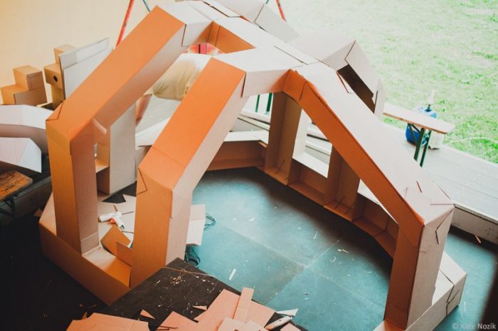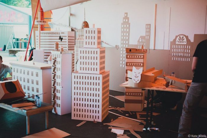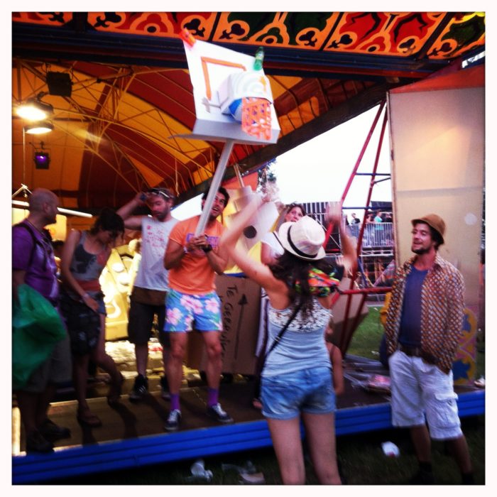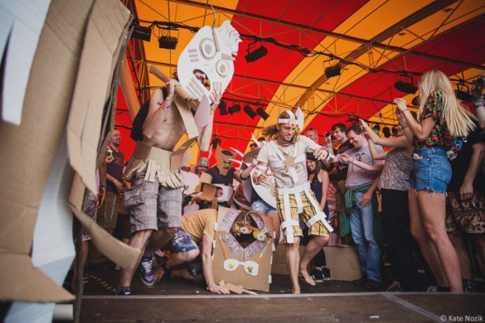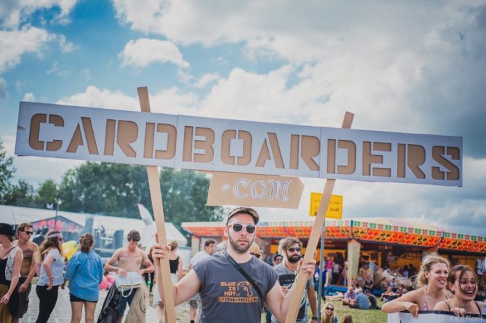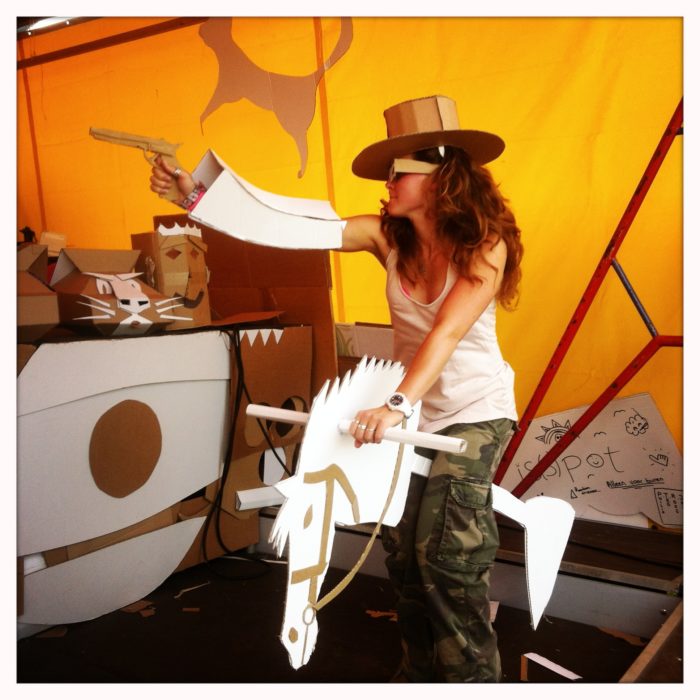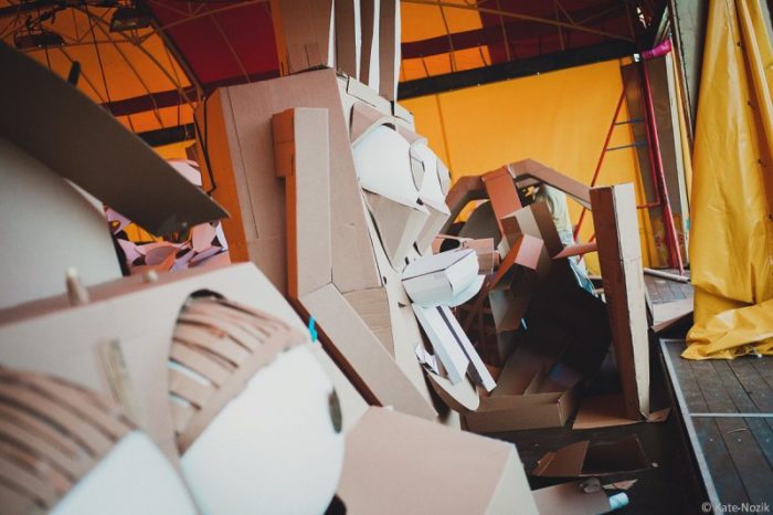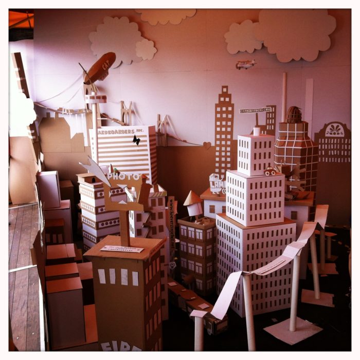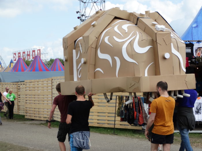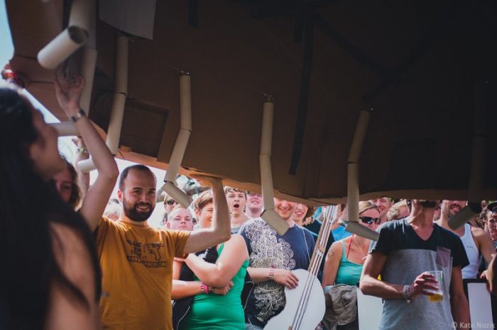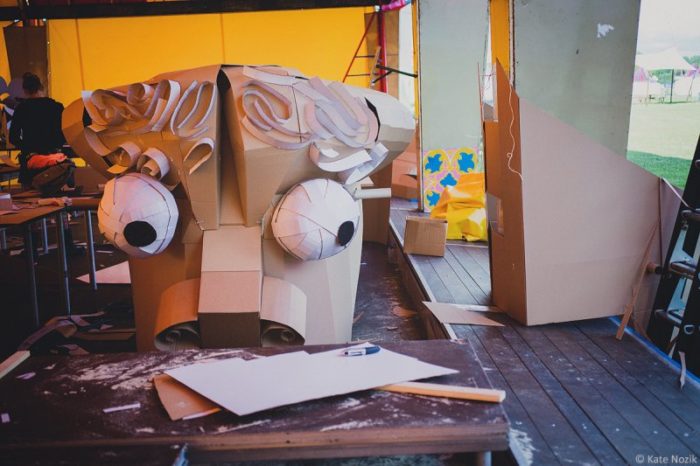 We came to the Lowlands festival with 22 hyped out Cardboarders from the Netherlands and Russia! Four days later 60.000 Lowlanders poured in to the terrain and just took over our venue (an old bumperstage). Crafting and tinkering people were everywhere! If you like to read something about the ambience: a great piece of (dutch) writing on 3voor12. Saturday was Cardboard Robotbuilding Day! LTV (captain video) made us a video of the Robot Run. On sunday we made some cardboard boats and tried the out: live on national radio! And then there was the parties at night, screening the weirdest animations from the KLIK! animation Festival!