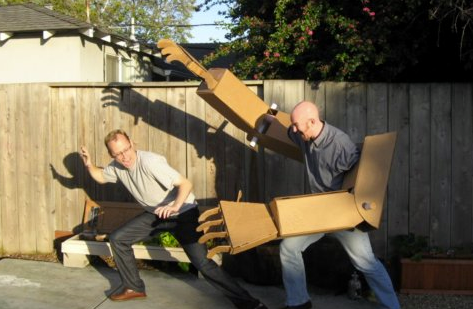 For all the lazy people out there. This guy (Jason Lentz), sells his Giant Cardboard Robot Arms online! Story goes he raised an interest for his arms by just dropping in on the Makerfair: doing a little dance… The extension of the human body is exciting, hence all the interest in superheroes, we also want superpowers! These robotarms look the right stuff: they are very basic, they have joints, they seem easy to wear. In most other cardboardrobot movies online you see people making beautifull suits. But most of the time something is missing. The makers only thought about the way the robot looks. But they are also supposed to do a task. Doesn’t matter what task they do (because most of the robots are really stupid). Maybe their only function is shoving things aside or stopping things. A cardboard robot should look like he’s capable of doing something. In the end the most important thing is not that a cardboard robot does something good. The important thing is that he looks good doing it. Let’s get a pair of these cardboard robot arms and look good in it 🙂
