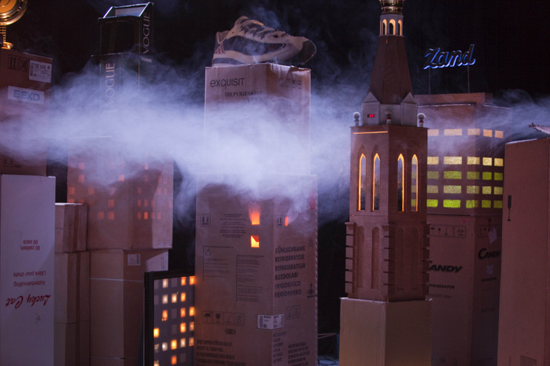 “A metropolis is created using an enormous assemblage of empty boxes and other packaging material, along with a sophisticated lighting design and an evocative soundscape. The audience is submerged into the seething, noisy chaos that is CITY for a night and a day. Fridges form a realistic skyline. Tiny illuminated lifts shoot up and down while on the roof a collection of elegant perfume bottles stroll about at a chic party. Earlier on, in a suicidal act, a banana threw itself off the roof. And so we sit, glued to our seats, won over by the obvious pleasure of the workers on the stage floor and the unexpected visual language – comprehensible for a wide age-range of audiences.”