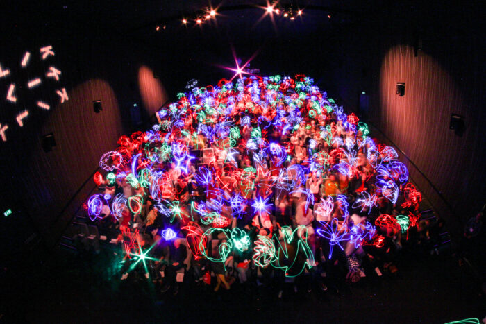 At the opening of Klik! Animation Festival we wanted to make an animation with everyone in the audience at the same time! We gave all the 300 people in the audience a light which they can draw with on the screen! We made a little live survey using their drawings. A sort of live data processing using light-painting! And some light-paint animation of course, that was kind of hard 🙂